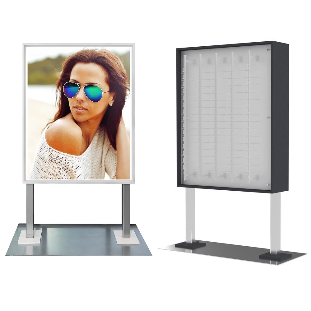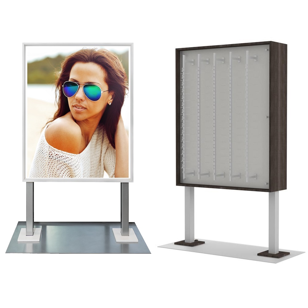 Utilize your window space with this eyecatching freestanding display! The window side exhibits a beautifully LED backlit SEG Graphic (artwork provided by you) and the interior side showcases a backlit acrylic panel with frame display rod style of your choosing.