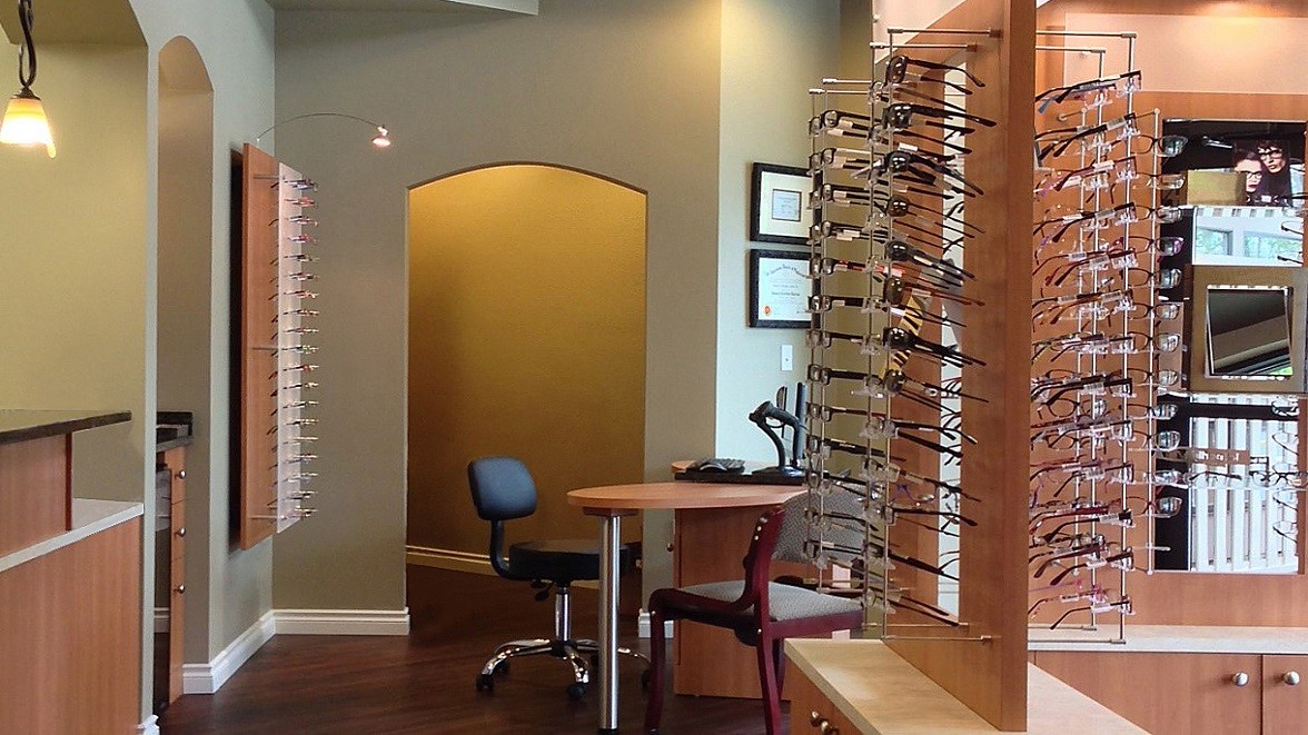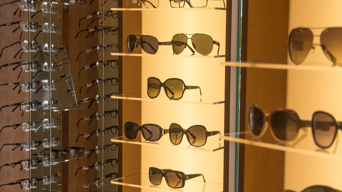 Display Style: The shape of this space and the traffic flows required a customized approach to the entire project. Frame displays creating freestanding traffic patterns, custom illuminated sunglass showcasing, and our Seattle Slims frame display rods were all part of this unique project.