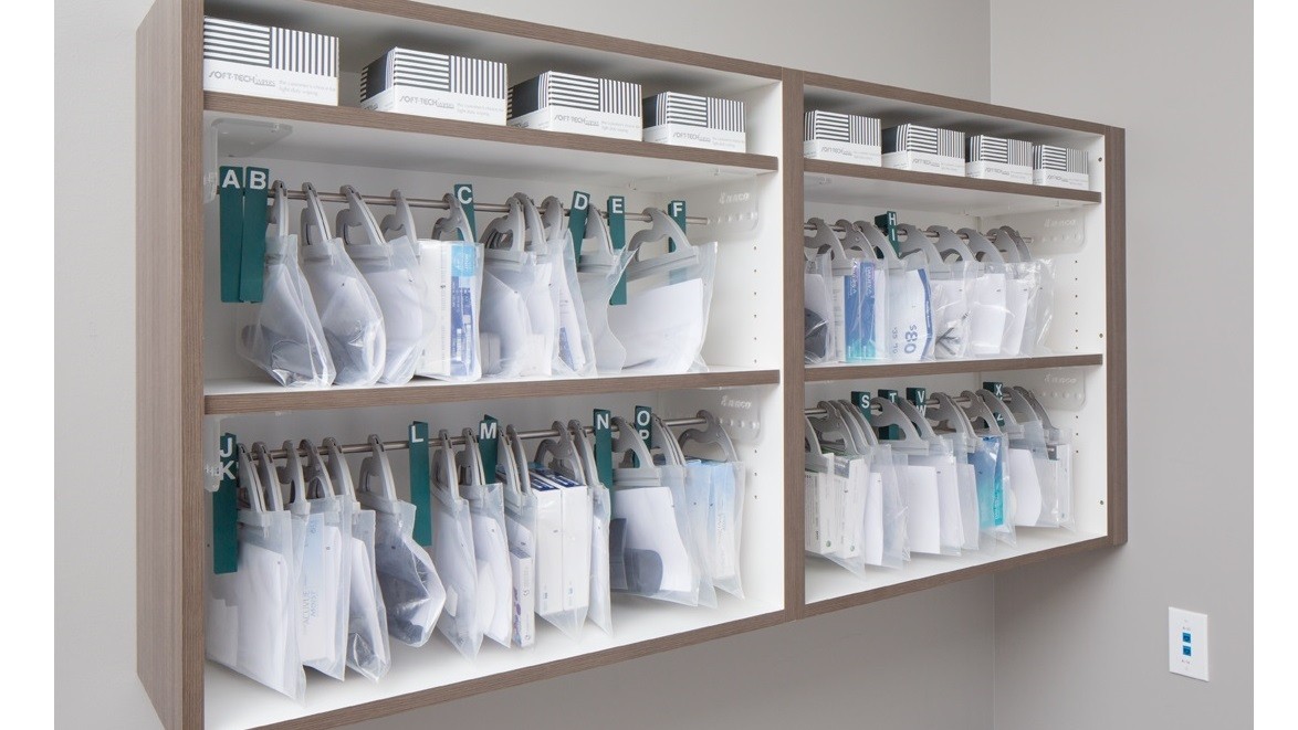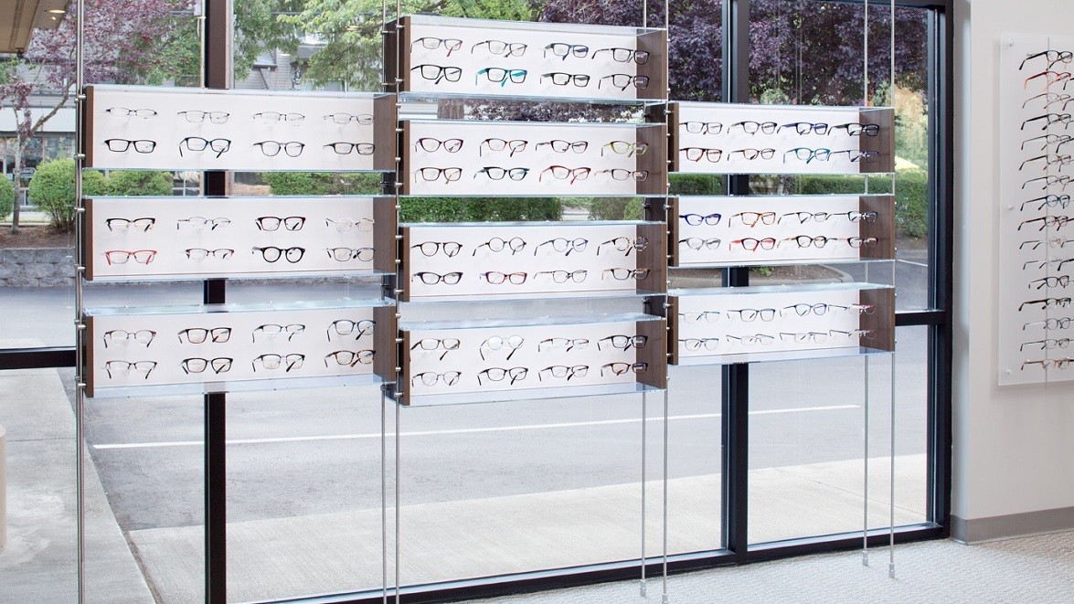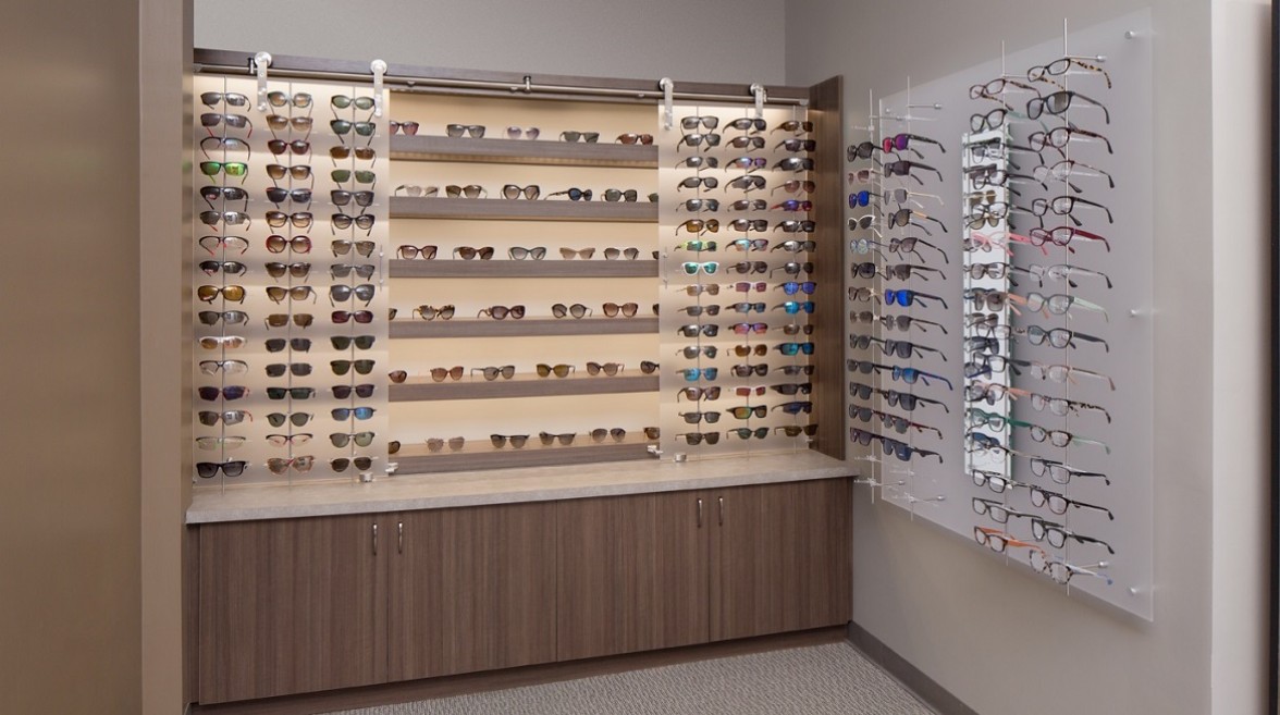 As the space took shape, the needs for streamlining the presentation of sunglasses became a focal point. The doctor and staff wanted illuminated shelving, but also wanted movable frosted panels. We created a clever presentation for them that ultimately lead them to add yet another sunglass display in the same area. Their new display has both illuminated shelving and fully articulating frame holders from our Flight System™ collection.