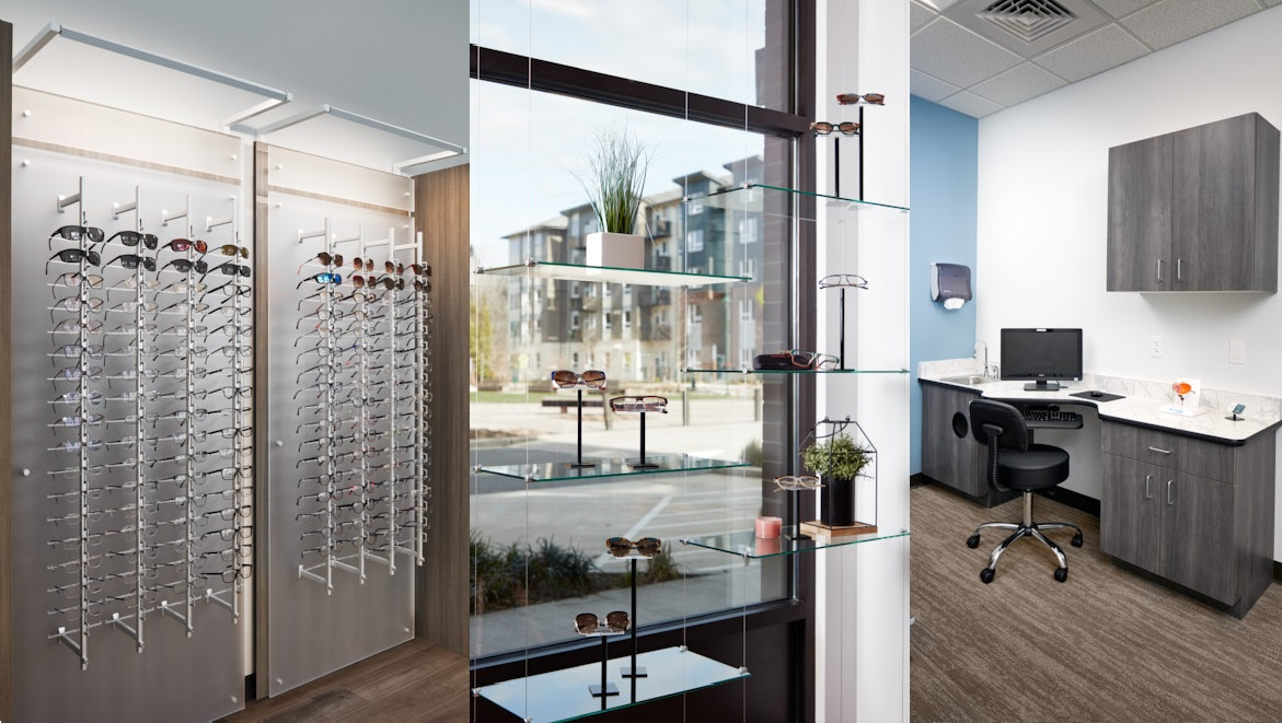 Ennco provided: Expansive Architectural Design Package with Permit Drafting and Submittal; Frame Displays and Fixtures, Reception Desk, Back Reception Casework, Exam Rooms, Lab Casework, Contact Lens Training Area Casework, Storage Room Casework, and Private Office Casework.
