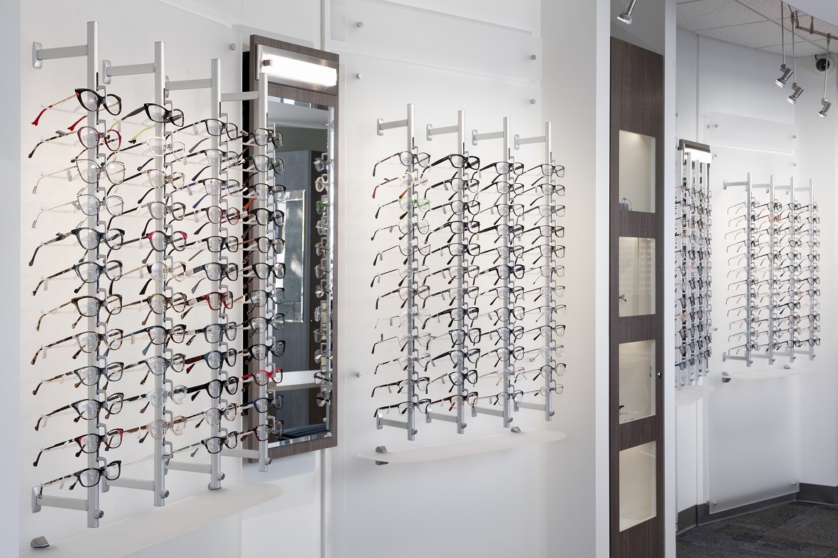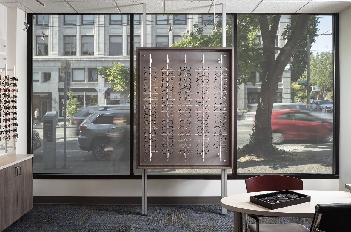 Dr. Balter was interested in utilizing his large window space to attract customers. We helped him effectively use his space by showcasing a brand-new display. The Grandstand is a frame display and marketing centerpiece all in one. The store facing side has multiple rods for frames to be displayed in a tidy and attractive manor, while the street facing side utilizes changeable SEG graphics that allow him to advertise a line of frames or a special he is putting on.