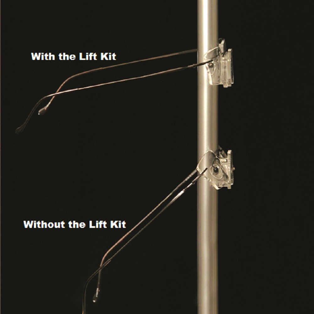 • Holds small-bridge frames more securely and upright on acrylic rod displays • Small, simple-to-place, clear plastic Lift Kit™ piece narrows the nasal space for a better fit